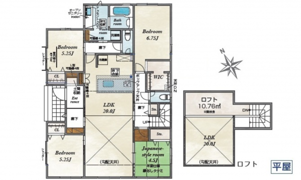 <平家建> LDK20 洋6.75 洋5.25 洋5.25 洋和4.5 WIC ロフト(階段含む)